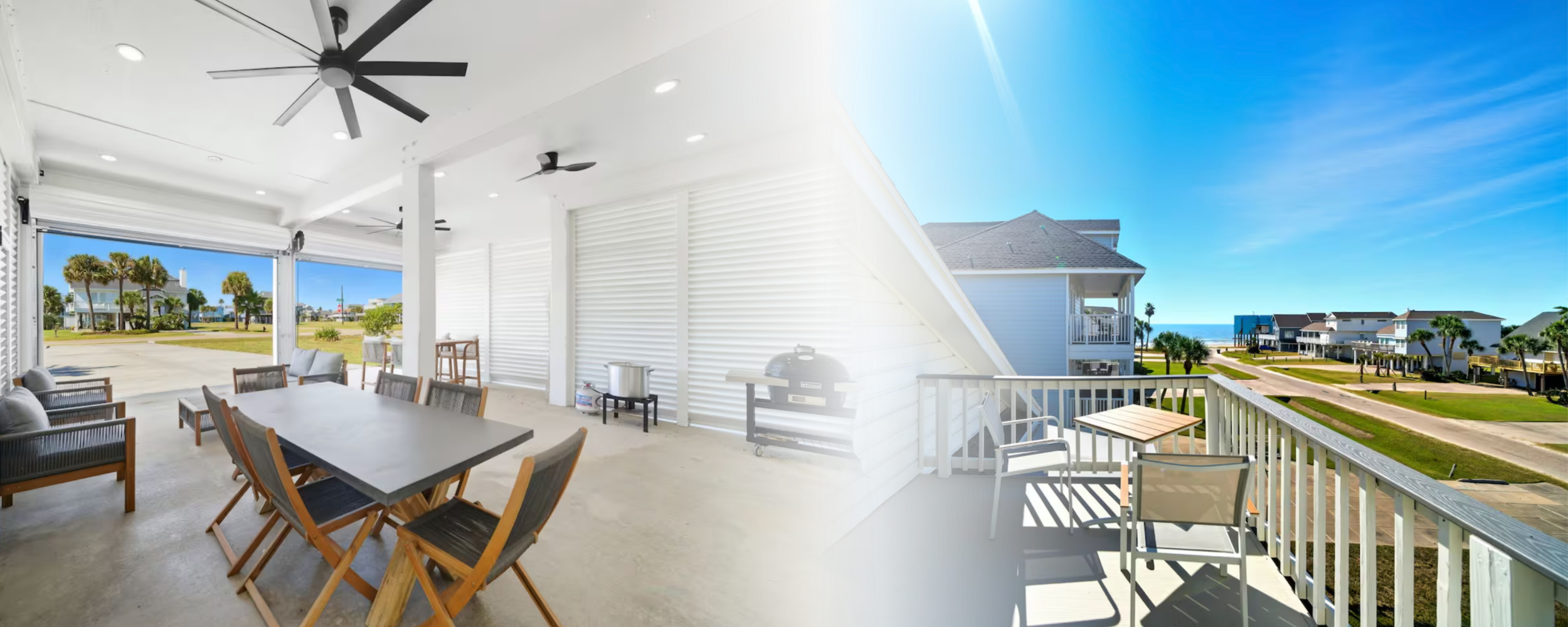 Step onto the spacious balcony from the living room and enjoy coastal breezes while dining outdoors or lounging under the electric awning with partial ocean views. The ground-level garage doubles as an outdoor entertainment zone with comfortable seating, TV, specialty egg grill, and propane boiler for cooking fresh Gulf seafood. Just steps away, rinse off in the outdoor shower, access the full bathroom, or relax on the swings after your beach day.
